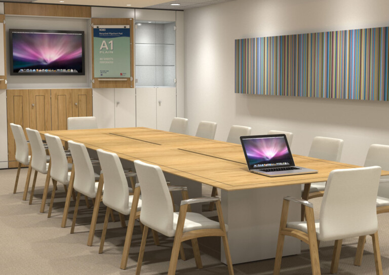 Other things to think about when designing your boardroom is the connectivity of your tv unit to laptops etc. You may also want to think about a room booking system for your office. This is more beneficial to larger businesses with multiple boardrooms that are used on a regular basis.